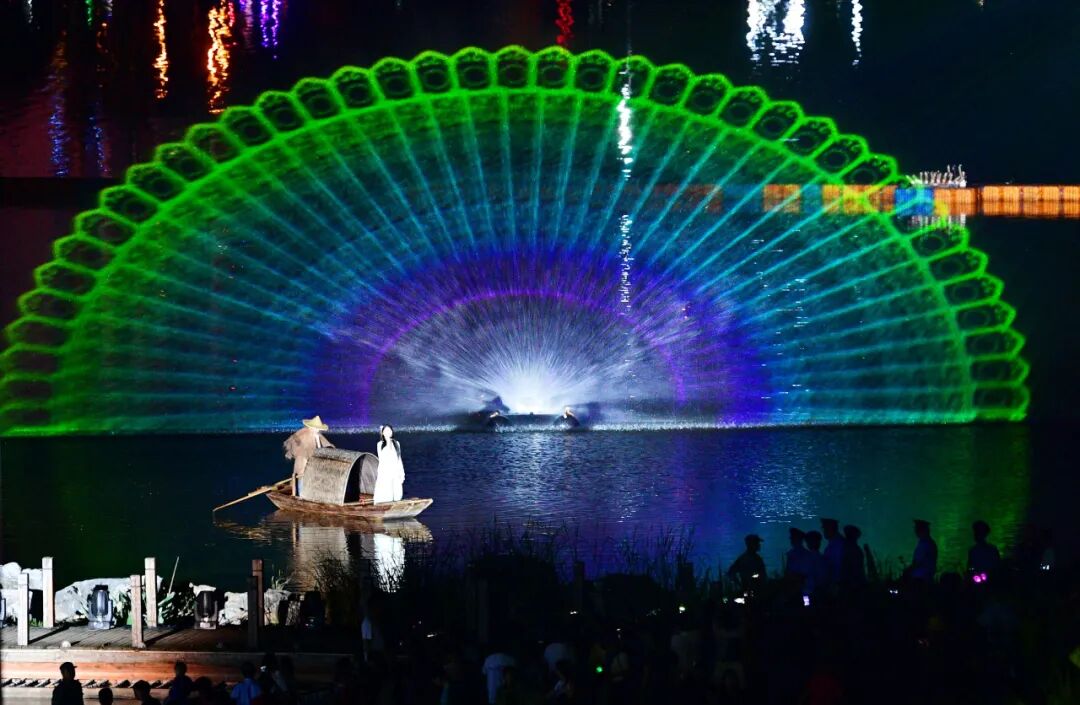 湖面水幕为屏,激光为笔,浏阳烟花为伴,渔舟唱晚,曾为G20杭州峰会表演的团队带来的湖上水幕电影,带领观众开启了一段奇幻美妙之旅。在节目后半段,烟花和水幕激光更是化身“领舞”,带领现场观众一起跟着音乐舞动,尽享欢乐。
