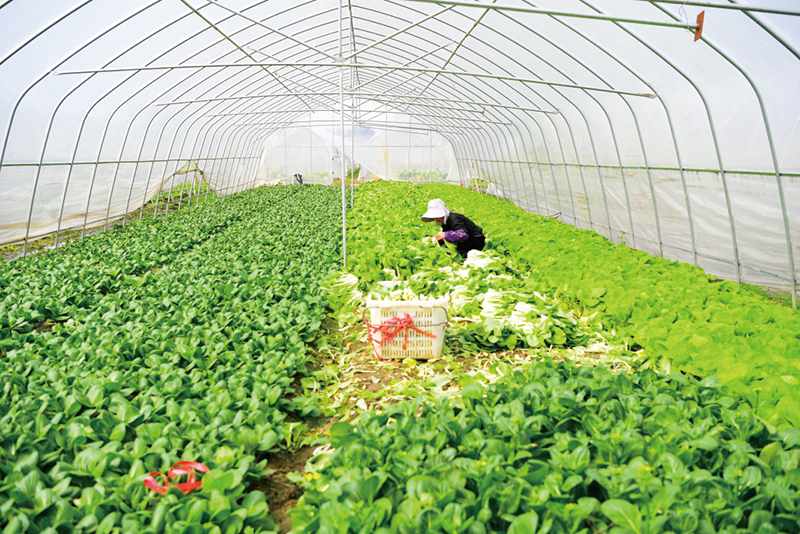 在沙龙村的蔬菜基地内,各色蔬菜一年四季不断档。大棚内,村民正在采摘蔬菜。